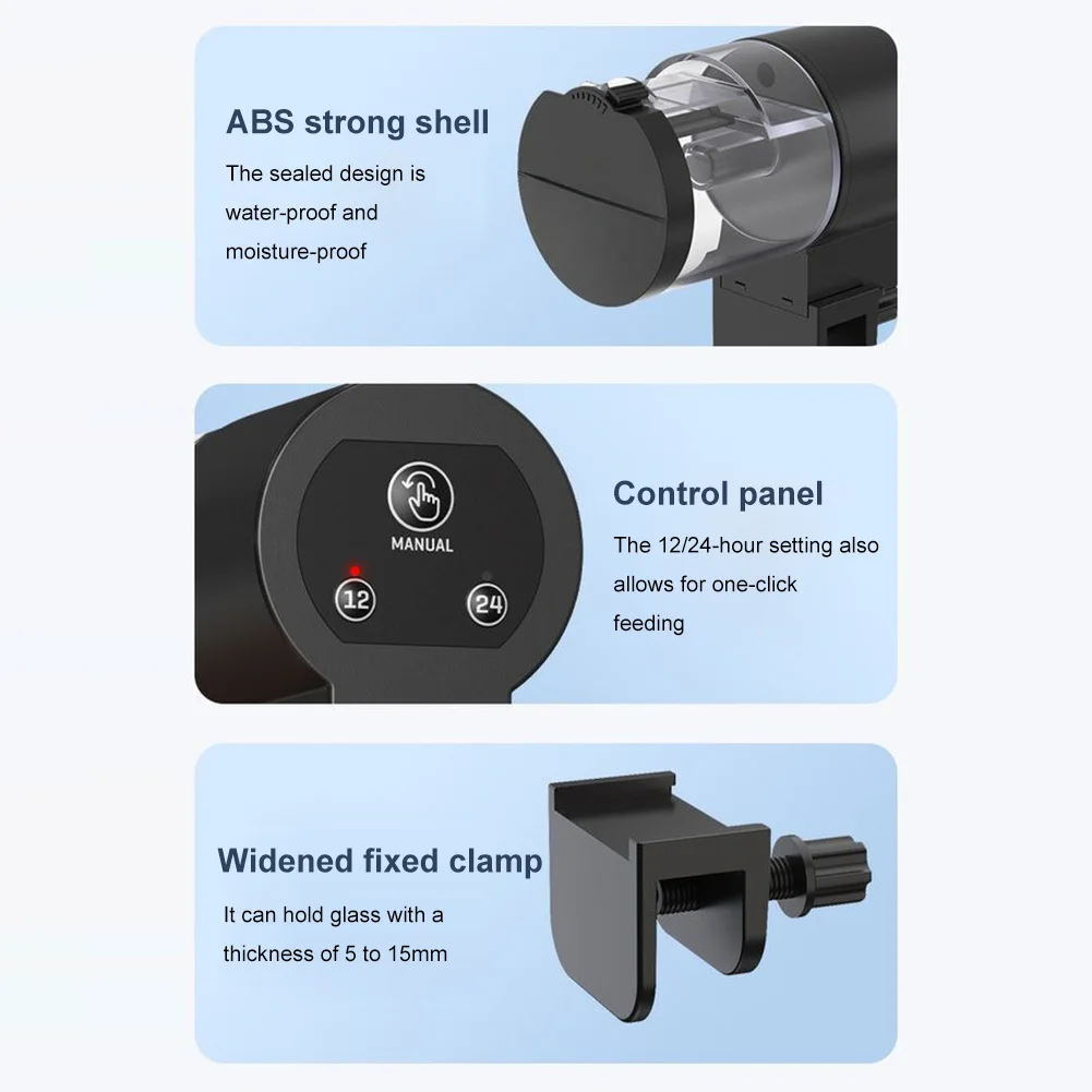 Features: 1.Timer Operation: Press the 12 or 24-hour timer button once. The product rotates, and the indicator light turns off. This indicates normal operation as the timer starts to automatically feed fish tank feeder at your specified intervals. 2.Manual and Automatic Modes: With the manual button, dispense food immediately. Use the timer function on the aquarium fish food dispenser to set feeding intervals (12/24 hours) for automatic feeding, providing convenience and flexibility. 3.Adjustable Feed Quantity: Customize the feed volume with the adjustable outlet size on the timer fish food dispenser to suit your fish's needs, ensuring proper nutrition without overfeeding. 4.Moisture-Proof Food Storage: The sealed container maintains dryness without clogging the outlet, suitable for strip, powder, granular, and flaky fish food types using intelligent control fish feeder technology. 5.Easy Installation: Install with the included mount for wall attachment or use double-sided adhesive to affix it to the lid. The 100ml aquarium goldfish feeder offers versatile placement options. Specification: Origin: Mainland China Product size: 120.00x60.00x60.00mm/4.72x2.36x2.36inch Minimum serving size: 50g Maximum serving size: 100g Gear: 7 gears Capacity: 100ml Material: Plastic Note: Due to different monitor settings and lighting conditions, the actual color of the item may vary slightly from the pictures. Thanks for your understanding! Please allow a 1-2 cm difference in measurements due to manual measuring. Â ![]() 1Set x Automatic Fish FeederÂ